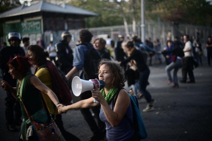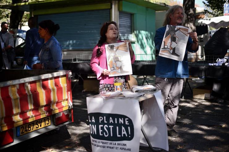 Samedi 13 octobre, un millier de manifestants partent en cortège contre le projet de la ville pour La place de La Plaine. Ils chantent « Touchez pas à la Plaine », l'hymne de l'opposition au projet de la mairie et de la Soleam, la Société locale d'équipement et d'aménagement de l'aire métropolitaine, une société publique locale. Composé par le musicien Manu Théron et popularisé par la chorale militante La Lutte Enchantée, ce tube local n'y va pas par quatre chemin, prophétisant une victoire finale contre les bulldozers : « Le peuple ici a toujours la peau dure / Non jamais vous ne nous ferez plier. »