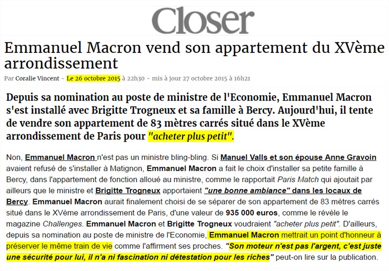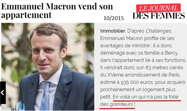 Pour finir, petite incise - amusante -, sur la vente de l'appartement. En octobre 2015, la presse indique que M. Macron a mis son appartement de 83 m² du XVe arrondissement en vente, pour "acheter plus petit" ( Source) :