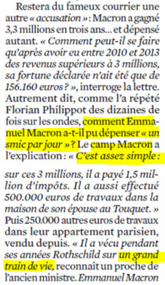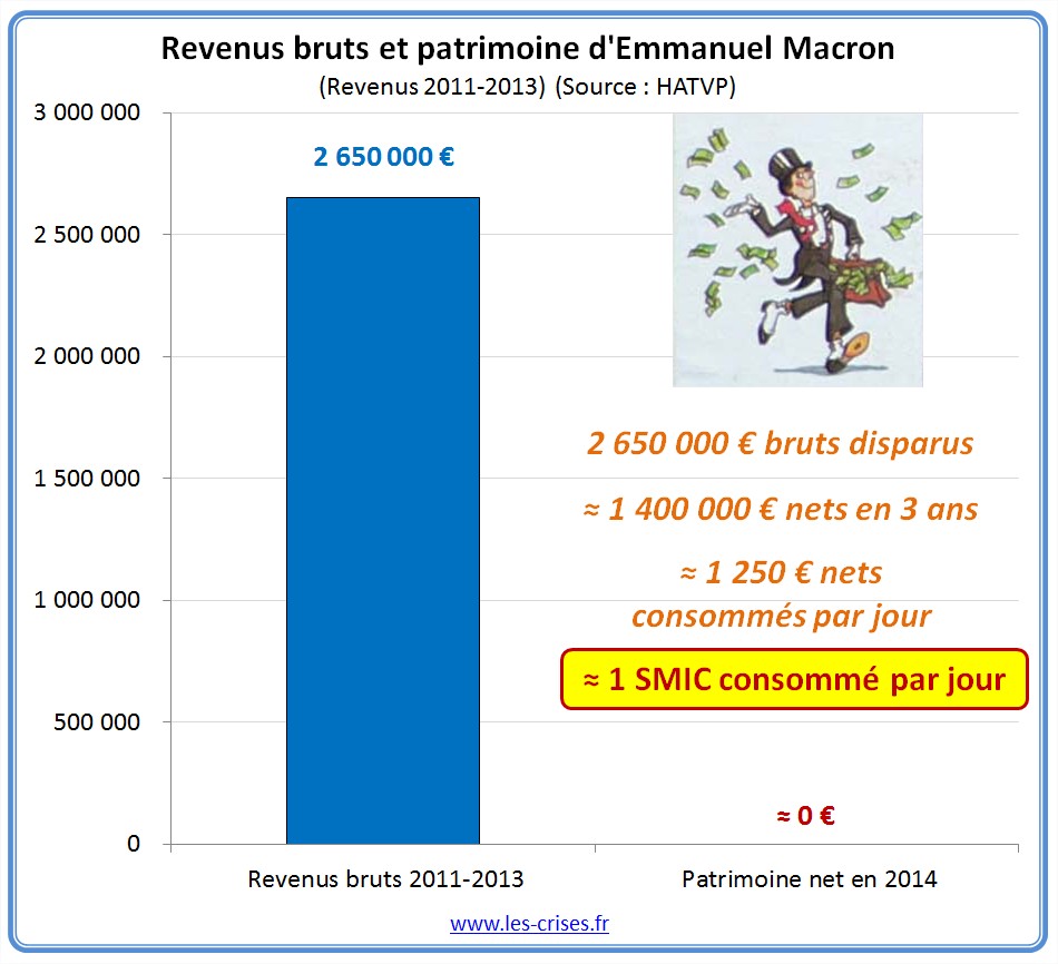 Et ce alors que M. Macron a perçu net d'impôt 800 € k€ au titre de 2011 et 600 k€ au titre de 2012, soit 1 400 k€. En enlevant les 150 k€ de travaux, on voit donc que 600 ou 800 k€ semblent s'évanouir en une année - soit près de 2 000 € par jour...