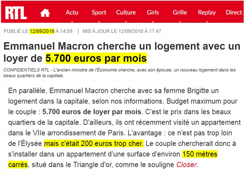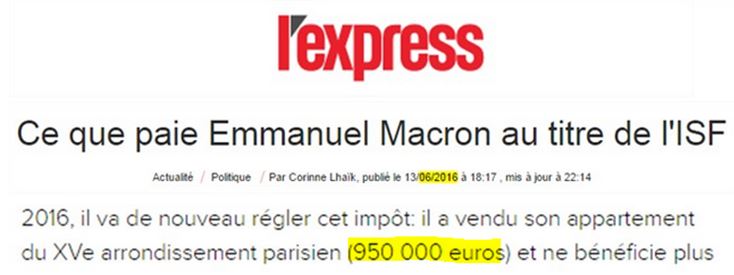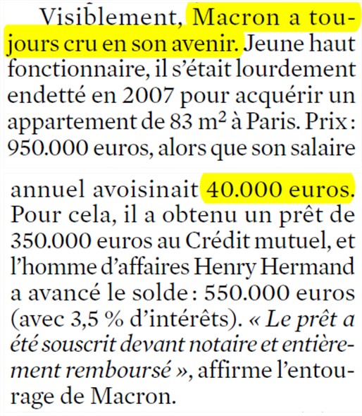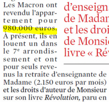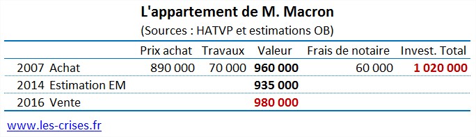 - M. Macron a acheté à crédit en 2007 un appartement parisien pour 960 000 € (prix d'achat + travaux) ; il l'a revendu en 2016 pour 980 000 €. Or, les prix ont augmenté de 33 % dans son quartier dans l'intervalle ;