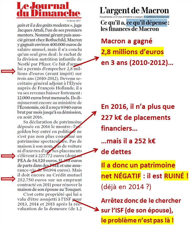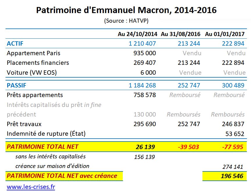 Train de vie, qui, en plus d'être franchement hallucinant (c'est normal pour un prince saoudien qui parcourt le monde, mais là on parle d'un banquier d'affaires et d'un secrétaire général adjoint de la présidence de la République, activités peu connues pour leur temps libre), a la singulière particularité (contrairement à un prince saoudien) de le conduire à un patrimoine négatif - bref, techniquement, M. Macron était "ruiné" mi-2016 ! (au sens "avoir plus de dettes que d'argent")