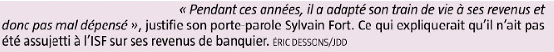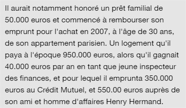 En 2012, alors qu'il gagne de grosses sommes chez Rothschild, il restructure son endettement : il emprunte 600 000 euros à sa banque (soit 250 000 € de plus que le montant initial, et donc + 270 000 € après les amortissements passés), et rembourse son ami le financier Henry Hermand de 350 000 €. Il ne s'est donc désendetté que de 80 000 euros.