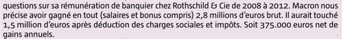 Ainsi, M. Macron a gagné environ 2,8 millions d'euros dans sa banque (cf. JDD 19/02/17) :