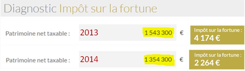 On sait que l'actif au 1/1/2014 est de 1 354 k€ avec une maison évaluée 1 453 k€, donc 1 153 k€ en valeur nette - soit 200 k€ pour tout le reste. L'appartement valant toujours -300 k€ en ISF, on a ici des placements financiers du couple de l'ordre de 500 k€.