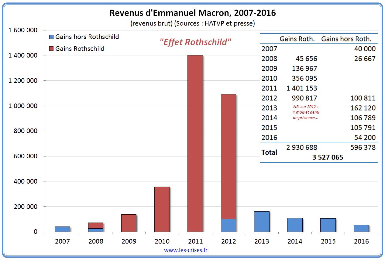 Plus largement, il a gagné près de 3,4 millions d'euros bruts entre 2009 et 2016 (en rouge les gains chez Rothschild, en bleu hors Rothschild) !