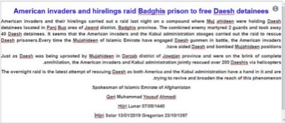 « Les envahisseurs américains et leurs laquais ont mené un raid la nuit dernière [le 12 janvier 2019] contre un campement des Moudjahidines où ils détenaient des membres de Daesh, situé à Pani Bus, district de Jwand, province de Bâdghîs. Les forces jointes ennemies ont tué en martyrs deux gardes et sont reparties avec 40 détenus de Daesh. Il semble que les envahisseurs américains et leurs comparses de l'administration de Kaboul ont opéré ce raid pour secourir les prisonniers de Daesh. Chaque fois que les moudjahidines de l'Émirat islamique [les Talibans] ont livré bataille à Daesh, les envahisseurs américains ont aidé Daesh et bombardé les positions des Moudjahidines. Exactement comme lorsque Daesh a été déraciné par les Moudjahidines de Darzab, district de Jowzjan, et étaient sur le point d'être éradiqués [en août dernier], les envahisseurs américains et l'administration de Kaboul ont secouru conjointement 200 membres de Daesh par hélicoptères ».