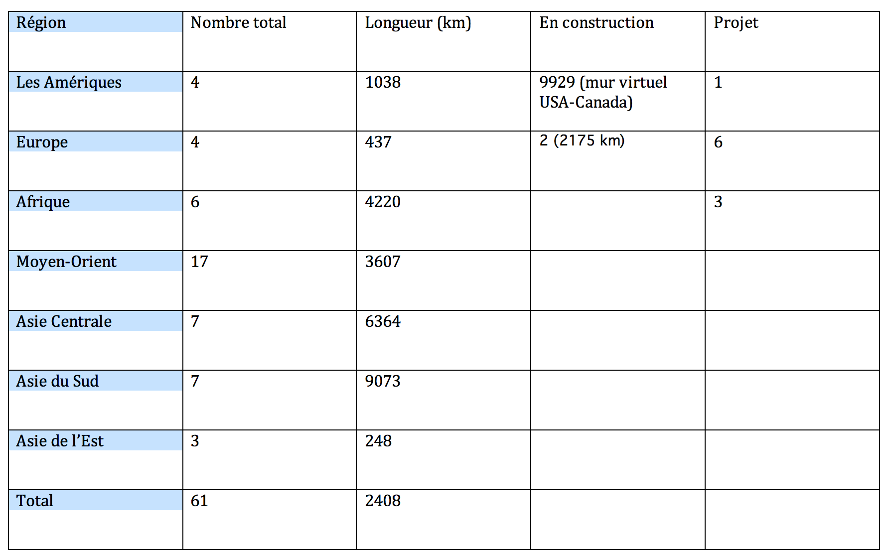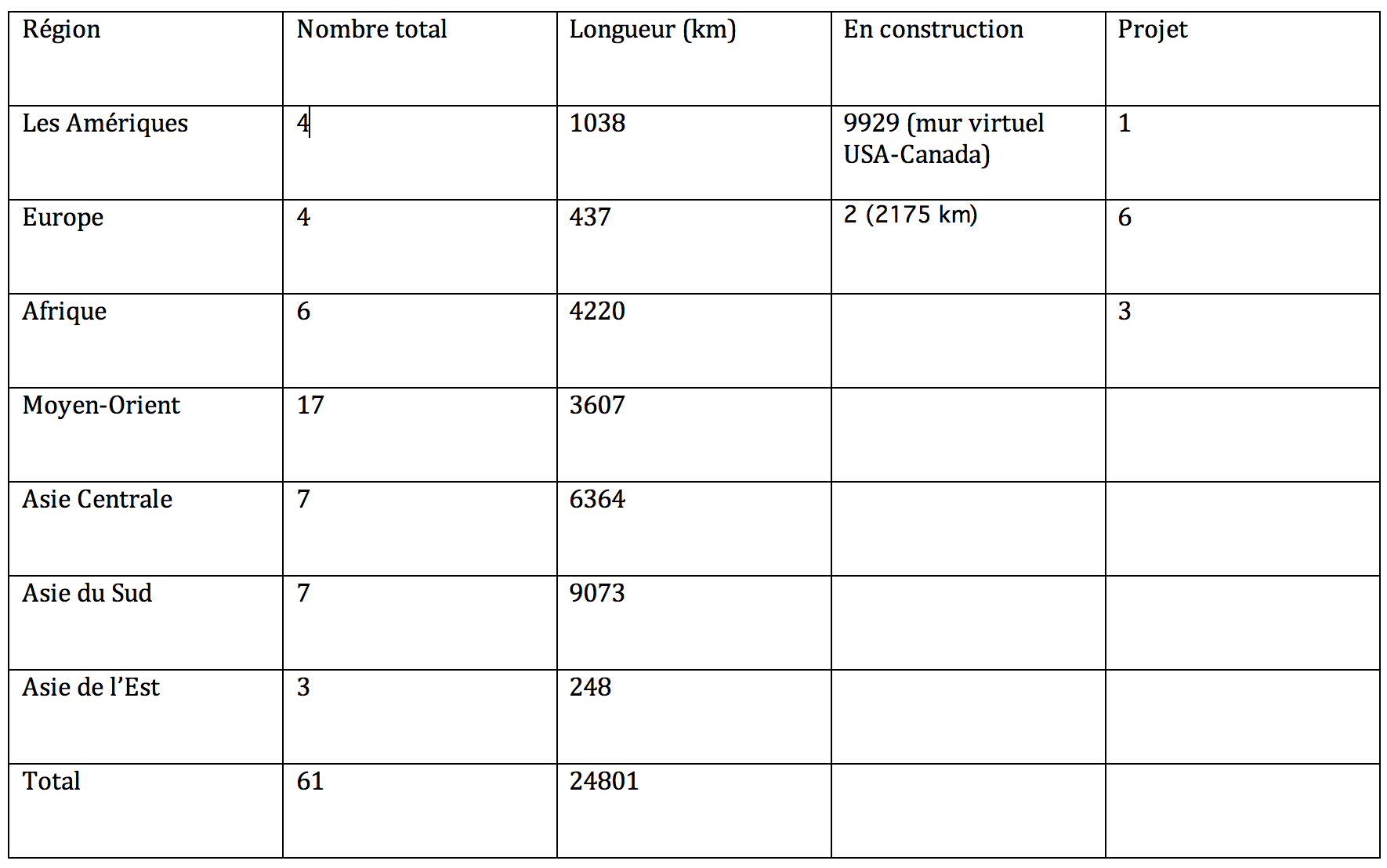 Dans cette synthèse nous formulons quelques constats tirés de cette analyse de la réalité mondiale des murs (carte 1 et figure 1). Nous présentons un tableau synoptique concernant la situation de chaque continent : nombre total de murs, leur longueur, les murs en construction et les projets annoncés. Nous proposons à la fin une liste de références générales sur le sujet.