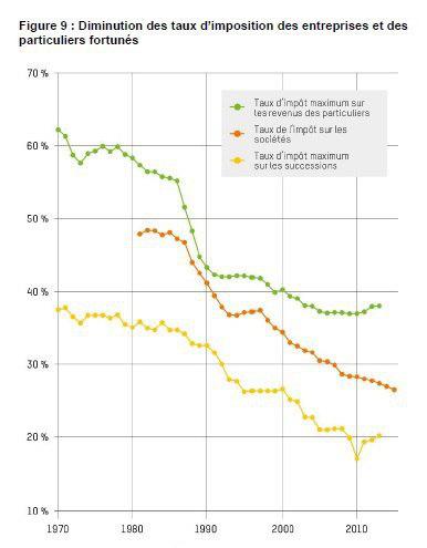 Face à ces constats accablants, Oxfam concentre ses recommandations dans la nécessité de développer des services publics universels et accessibles et de combattre les inégalités fiscales. En effet, le rapport montre que les seuls impôts ayant diminué dans les dernières décennies concernent le revenu, le patrimoine et les successions (voir graphique). L'actuel système fiscal n'est pas seulement injuste mais aggrave également les inégalités sociales. De plus, si nous comptons l'ensemble des mécanismes que les grandes fortunes utilisent pour échapper à leurs obligations fiscales (atteignant la somme de 7,600 milliards de dollars), nous arrivons à des taux d'imposition effectifs ridicules.