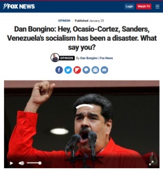 A la tête de cette campagne, on trouve Fox News et d'autres publications conservatrices. Un article d'opinion de Fox ( 25/1/19) affirmait que les états-uniens devraient être "absolument dégoûtés" par l'"escroquerie" de Bernie Sanders et de démocrates comme Alexandria Ocasio-Cortez (AOC), Elizabeth Warren et Cory Booker, qui "continuent à promouvoir un système qui provoque une famine massive et la faillite d'un pays", avertissant le lecteur que c'est exactement ce que produiraient aux Etats-Unis leurs politiques socialistes qui ont échoué partout. (Si on revient au monde réel, notons que si Sanders et Ocasio-Cortez se revendiquent comme socialistes, Warren se définit comme capitaliste, et Booker est connu pour ses liens avec Wall Street, dont il aurait sollicité l'appui pour son offre présidentielle). Un deuxième article de Fox News ( 27/1/19) continue dans la même veine, pour nous avertir qu'"au coeur de l'écroulement du Venezuela il y a une liste interminable de politiques socialistes qui ont décimé son économie."