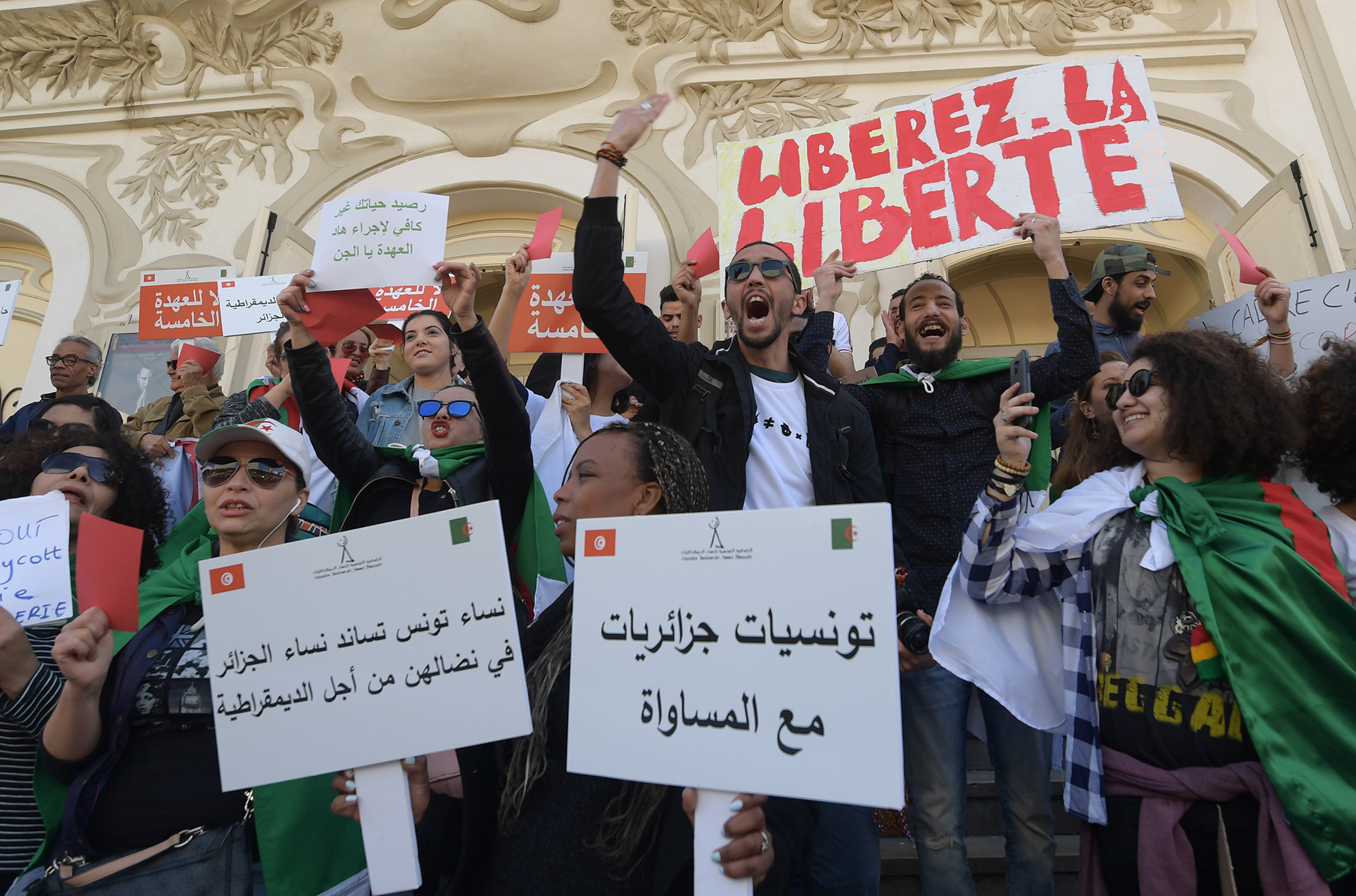 Le 1er mars 2019 à Tunis, une première manifestation de solidarité avec le peuple algérien a été violemment dispersée par la police. Une seconde, organisée le 9 mars à l'initiative de plusieurs organisations de la société civile ne rassemblait qu'une petite centaine d'Algériens et de Tunisiens. À la retenue des Tunisiens à investir massivement la rue pour exprimer spontanément leur solidarité se sont ajoutées les paroles timorées du chef de l'État, seul acteur de la classe politique à s'être exprimé sur les manifestations en Algérie. Le 25 février, alors qu'il était en déplacement à Genève, Béji Caïd Essebssi faisait une déclaration qui prenait soin de ménager à la fois la susceptibilité des Algériens et de leurs dirigeants : « Le peuple algérien est libre de s'exprimer comme il l'entend sur sa gouvernance », disait-il dans un premier temps, avant d'ajouter : « Chaque pays a ses propres règles, je n'ai pas le droit de donner des leçons à qui que ce soit ».
