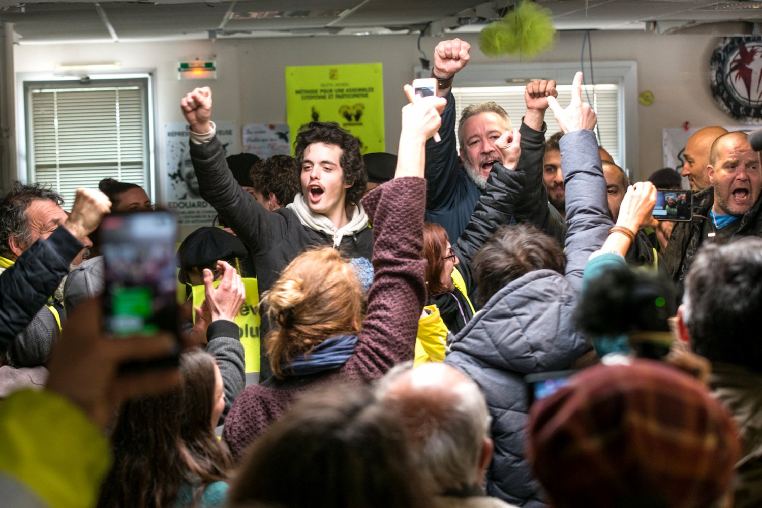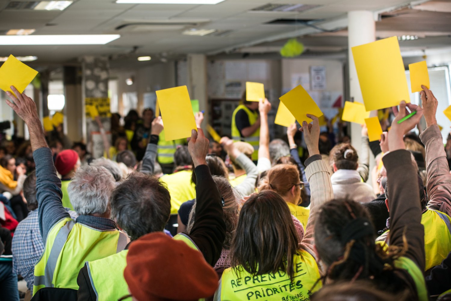 Ce sont près de 800 personnes délégués de 200 groupes locaux, observateurs non mandatés, bénévoles, journalistes qui se sont retrouvées vendredi 5 avril dans « la Maison du peuple », une ancienne agence pour l'emploi occupée depuis plusieurs mois par les Gilets jaunes de Saint-Nazaire. La mairie avait refusé de prêter un local, et fait pression sur les communes avoisinantes pour empêcher toute aide, si bien que les Gilets jaunes de la ville portuaire ont choisi de tenir l'assemblée dans leur maison.