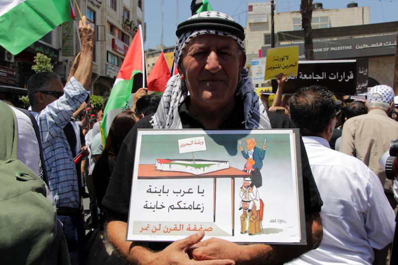 Des Palestiniens manifestant à Ramallah lundi 24 juin contre la conférence à Bahrein (Photo : Ayat Arqawy/APA Images)