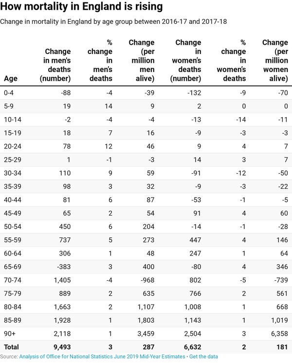 Women did a little better than men according to these latest figures - and the table above shows a 2% rise in age-adjusted mortality rates in the year to summer 2018. But in earlier years it's been mostly women who've died in the greatest increasing numbers. For women in England the highest rise in mortality rates has been for those in their 90s with an additional 2,504 dying of these oldest ages - an additional 6,358 per million at risk. This is the largest rise of all shown in the table above.