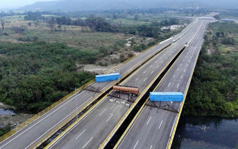 Le pont Las Tienditas. Devant les containers placés par le gouvernement vénézuélien, les grilles posées par le gouvernement colombien.