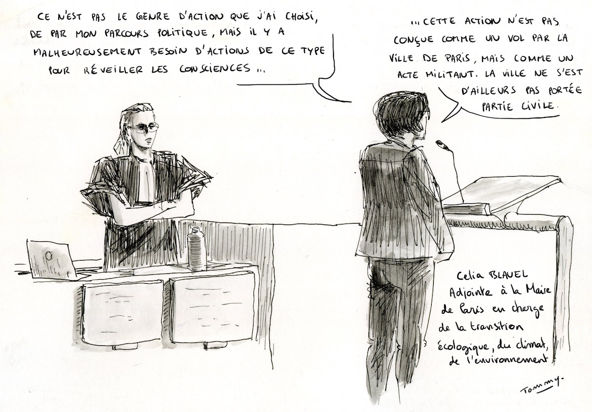 Las, le débat tourne souvent au café du commerce. Ainsi, lorsque Célia Blauel, adjointe à la mairie de Paris chargée de la transition énergétique et du climat, venue témoigner en faveur des prévenus, tente de développer : « À Paris, on a mis 40 millions d'euros pour cette politique et pourtant nous ne sommes pas encore à la hauteur. Il faut vraiment qu'on arrive à avancer ensemble, toutes les politiques publiques : l'État, l'Europe, les villes... » La magistrate l'interrompt : « Il n'y a pas que les politiques. De simples particuliers peuvent changer leurs fenêtres pour avoir une meilleure isolation... »