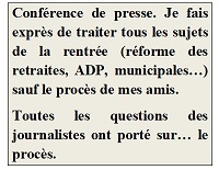 Malgré tout la vie politique doit continuer. Car c'est une des techniques du Lawfare que de vous neutraliser, vous paralyser pour vous empêcher de faire l'essentiel de ce que vous avez à faire : de la politique. On nous a beaucoup reproché par exemple en cette rentrée de ne parler que de notre procès. C'est faux. La semaine dernière, je donnais une conférence de presse de rentrée au siège du mouvement. A l'ordre du jour, j'ai fait exprès de mettre tous les sujets de la rentrée, sauf le procès de mes amis : réforme des retraites, ADP, municipales... Toutes les questions des journalistes ont porté sur... le procès, évidemment !