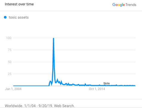 Vous vous souvenez du terme « actifs toxiques » ? Google Trends montre ci-dessous un pic énorme pour ce terme de recherche en mars 2009 et puis... rien. Nous ne les appelons plus « actifs toxiques », nous les appelons simplement « actifs » maintenant, s'il vous plaît ne dites rien et lisez simplement. Il y a des choses qu'il faut accepter comme des faits.