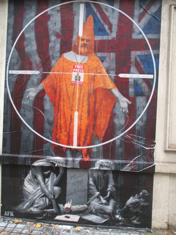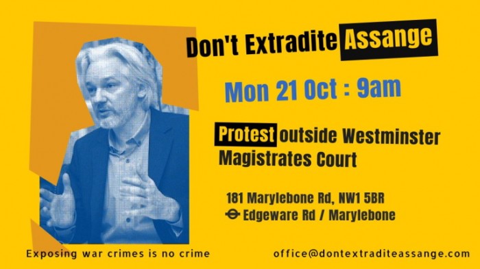 Voilà donc que le 21 octobre 2019 au petit matin je me retrouve devant la Westminster Magistrate Court dans l'espoir que peut-être les avocats de Julian Assange vont demander sa libération et que peut-être, innocent qu'il est, sortira -t-il ce soir libre... Avec ma collègue de Wikijustice nous avions préparé de petits panneaux portés sur des tee-shirts avec de petits messages. Nous voulions les brandir devant le fourgon de la société privée qui devait l'amener au tribunal par une porte située dans une rue latérale. Mais nous avions déjà compris qu'il y aura plein de policiers, que cela serait interprété comme une tentative d'aide à l'évasion et risquait d'obérer nos chances d'entrer dans le tribunal.
