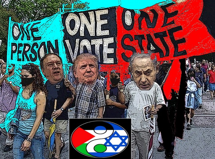 Quoique par inadvertance, Trump a finalement engagé les USA dans la solution à un seul État. Il est difficile de nier que la zone située entre « le fleuve et la mer » ne constitue qu'un seul morceau de terre. Elle partage un réseau électrique, un indicatif téléphonique international (+972) et un réseau d'égout. Présentement, la terre est gouvernée par une idéologie raciste, tribale et discriminatoire par le biais d'un appareil qui s'appelle « l'État juif » et qui se proclame foyer de tous les Juifs du monde ; simultanément, il est abusif, meurtrier et, diraient certains, génocidaire envers le peuple autochtone de cette terre.