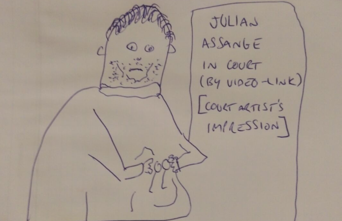 « Greekemmy » a du mal à prouver que sa légitimité est plus forte que la nôtre. Après tout c'est une citoyenne lambda dans ce dossier, comme tous ceux qui viennent pour diverses raisons assister à des audiences dans les tribunaux. Le secrétaire hésite puis finit par dire : « est-ce qu'il y a la famille ? ». Les familles complètes des extradés polonais et roumains du jour se tiennent derrière, certainement agacées de ne pas pouvoir assister leur proches à cause de ce tumulte. « Greekemmy » annonce que « oui, le père est là, mais il est en bas ». Le secrétaire décide de privilégier « la famille » et John Shipton arrive peu après, sans avoir été mêlé à l'ambiance de violence qui caractérise la lutte pour le sort de Julian Assange. Mais avec lui le secrétaire du tribunal fait entrer en premier toute une ribambelle de la liste de « Greekemmy ». Parmi ceux-là, les deux jeunes de 20 ans qui devaient être à l'école primaire quand Julian Assange était libre et actif. Nous ne comprenons pas leur plus grande légitimité que la nôtre à se trouver là. Puis les femmes amies de la cheffe du commando et Anu Schukla qui joue le rôle de garde du corps de John Shipton, en tout dix personnes. Nous protestons. Enfin, et c'est le miracle de l'arbitraire de l'entreprise de sécurité, ou de la « justice » du tribunal, le manager de Mitie réouvre la porte et permet à trois personne de plus de s'engouffrer dans la salle.