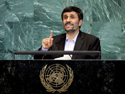 Le président Mahmoud Ahmadinjed à la tribune de la 65ème session de l'Assemblée générale de l'Onu, le 23 septembre 2010, remet en cause la version officielle des attentats du 11-Septembre 2001 aux USA.