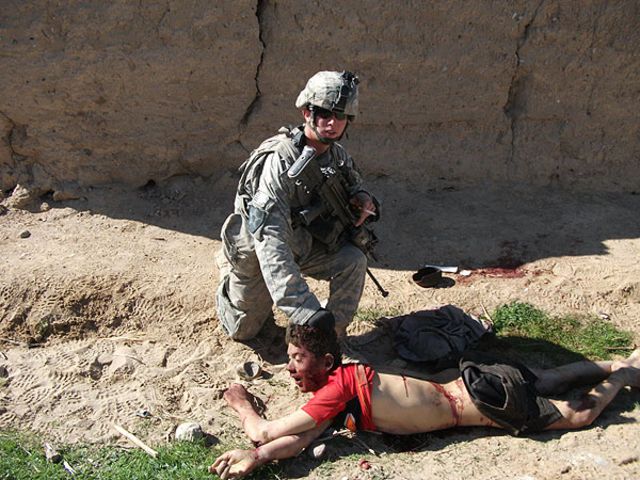 Soldat américain avec le corps de Gul Mudin, 15 ans.