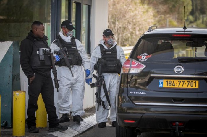 Point de contrôle à Jérusalem : la police des frontières israélienne utilise des combinaisons de protection et des masques. Photo JINI/ XinHua/ DPA