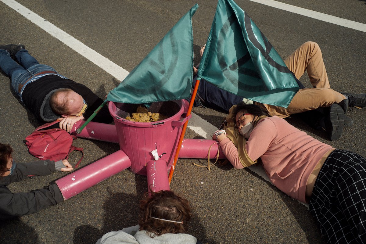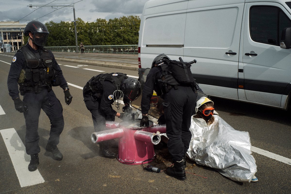 Les militants et militantes d'extinction Rebellion qui se sont entravés sont délogés à la disqueuse par la police, qui coupe avec minutie les blocs de béton. La presse n'est pas autorisée à approcher de trop près.