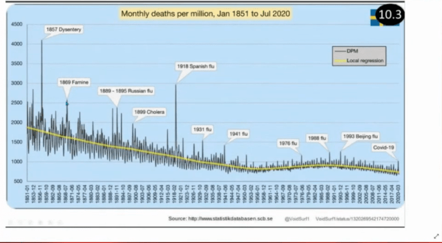 Pour en finir, une dernière petite courbe édifiante des pandémies de 1857 à 2020, du genre de celles qu'on ne voit pas à la télé :