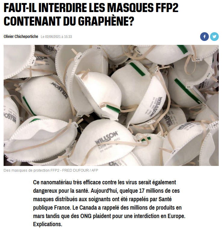 Dans le cas de l'équipe espagnole on n'a analysé que certains masques. Mais voilà, il y a tous ceux qui ne l'ont pas été et qui continuent d'inonder la place publique, dont les écoles! Et plutôt que de faire retirer ces masques et de laisser les enfants respirer librement, on préfère palabrer sur la question. « Y-a-t-il un vrai risque pour la santé? La question est loin d'être tranchée. Comme tout nanomatériau, le graphène peut présenter des risques, surtout s'il est ingéré ou respiré. Mais on ne sait pas s'il y a un vrai risque d'inhalation par les humains à travers un masque. Les études sont encore en cours. » bfmtv.com