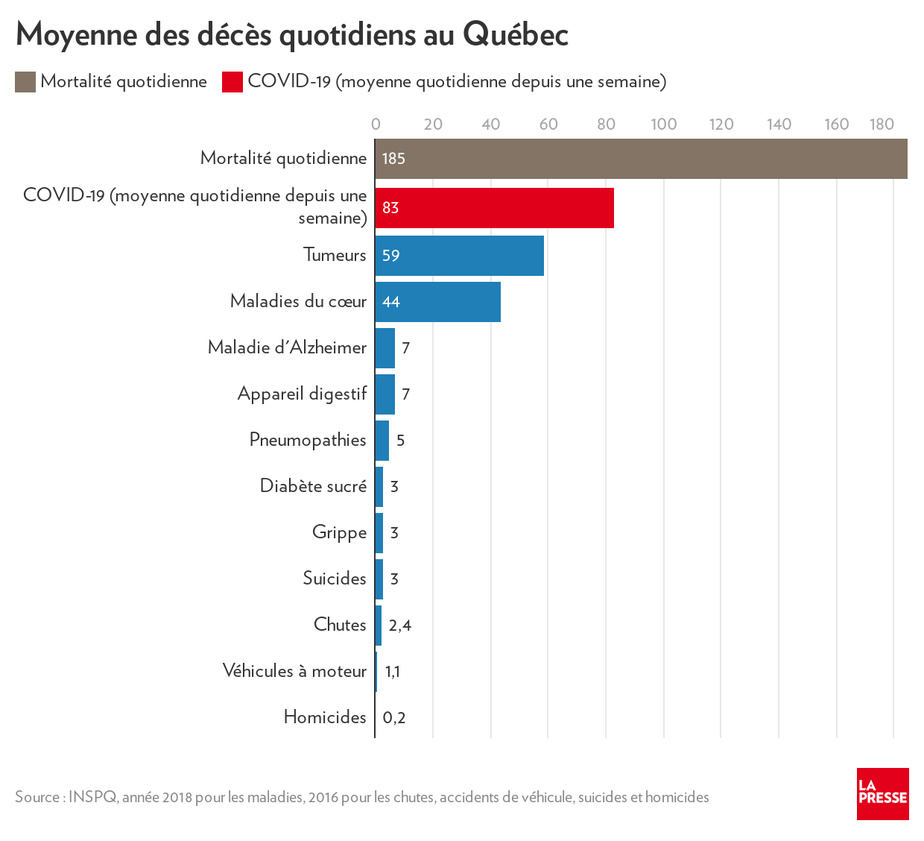 La directive est émise le 16 avril 2020. Quatre jours plus tard, Lundi le 21 avril 2020, 44.9 pour-cent de la mortalité au Quebec est assigné à la Covid-19 « devançant la moyenne quotidienne de morts attribuables aux cancers et aux maladies cardiaques »