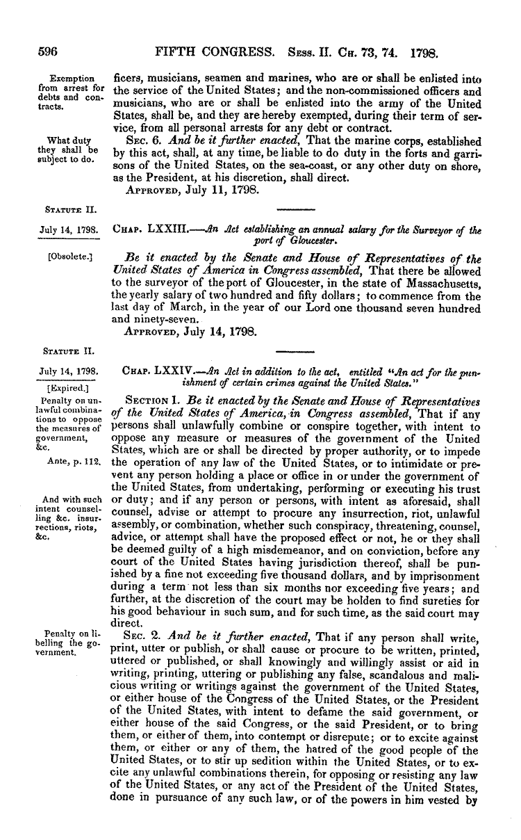 Congress did not renew the Act in 1801 and President Thomas Jefferson pardoned prisoners serving sentences for sedition and refunded their fines.