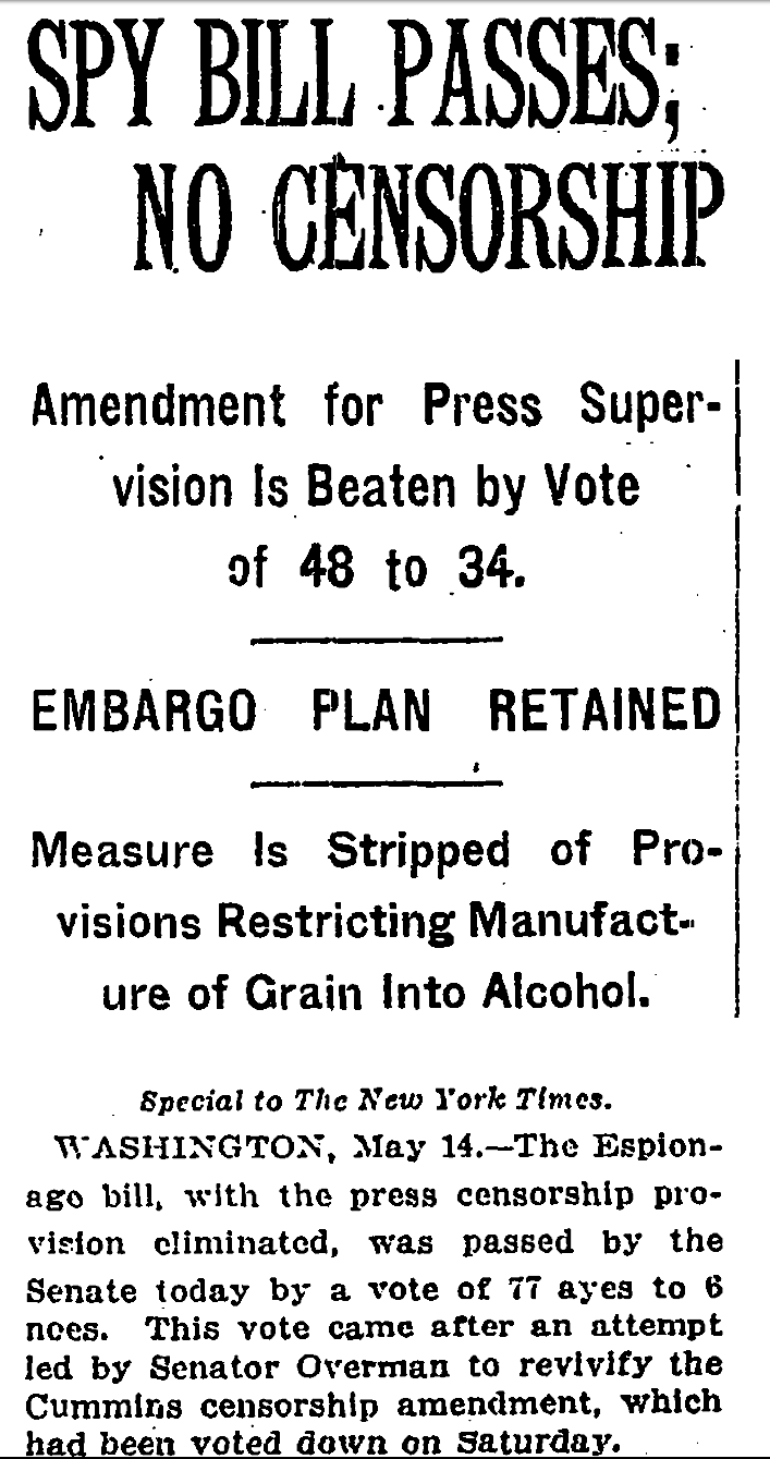If Wilson had had his way, however, prior restraint - or formal government censorship - would have become legal. He sent Congress a version of the Espionage Act that explicitly called for it.