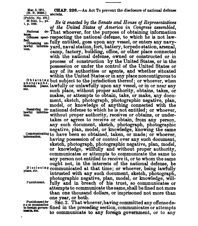 Just three paragraphs long, the language contained in the Defense Secrets Act is closely aligned with the Official Secrets Act. Section 1 of the DSA covers any person "obtaining" defense information "to which he is not lawfully entitled." Anyone who "receives or obtains" such information "without proper authority" also broke this law.