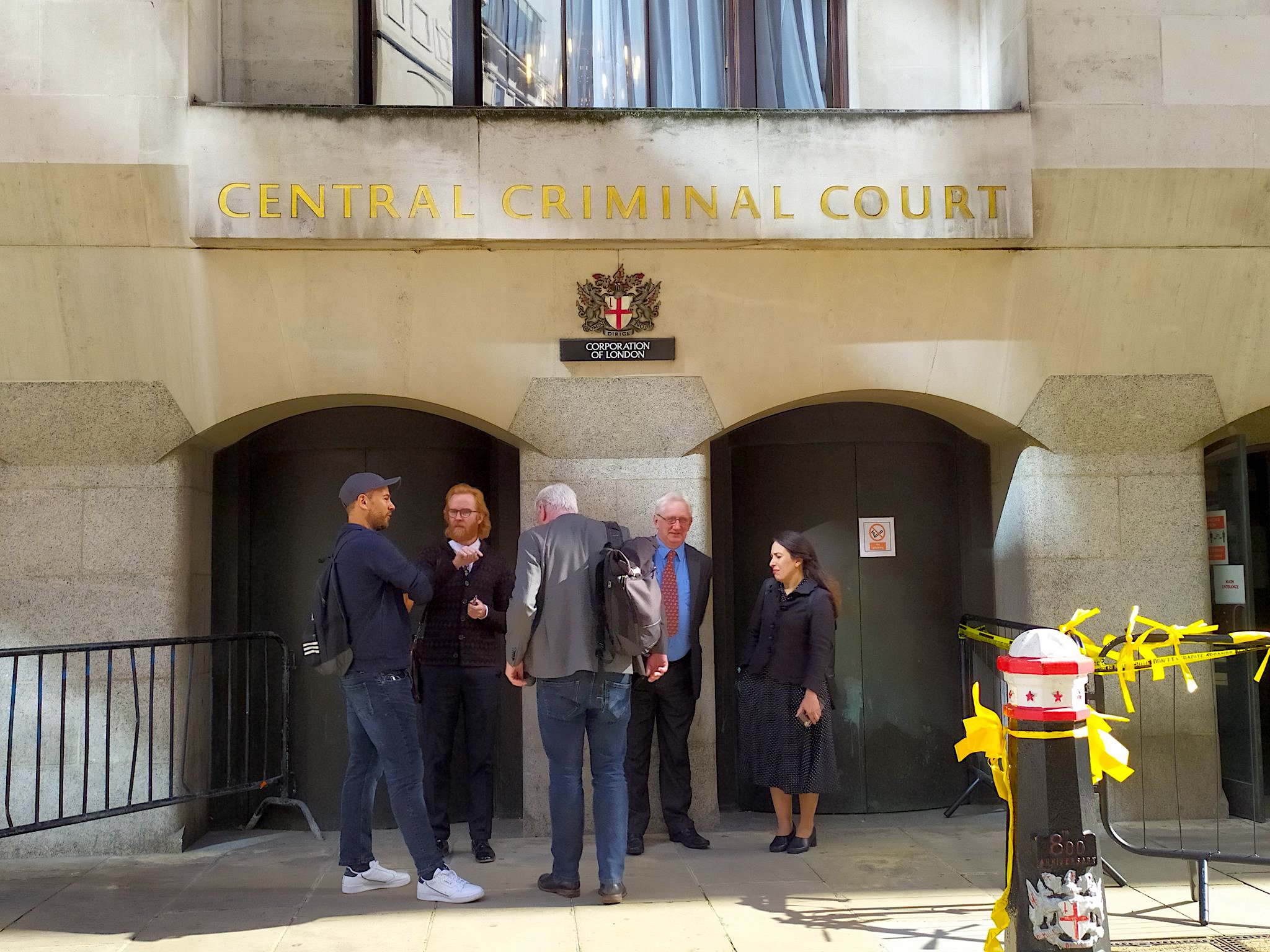 Joseph Farrell, (second from left), Kristinn Hrafnsson, Craig Murray and Stella Moris during break outside Old Bailey, Sept. 24, 2020. (Mohamed Elmaazi)