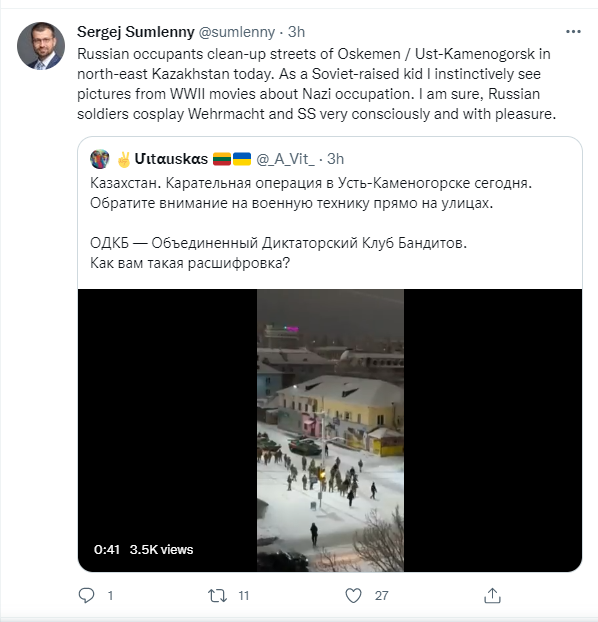 Nor can it be said that Russia has "invaded" Kazakhstan, as so many have liked to claim this past week on Twitter. Take for instance all these Tweets from the likes of one-time US Ambassador to Moscow Michael McFaul and former Estonian president Toomas Hendrik Ilves