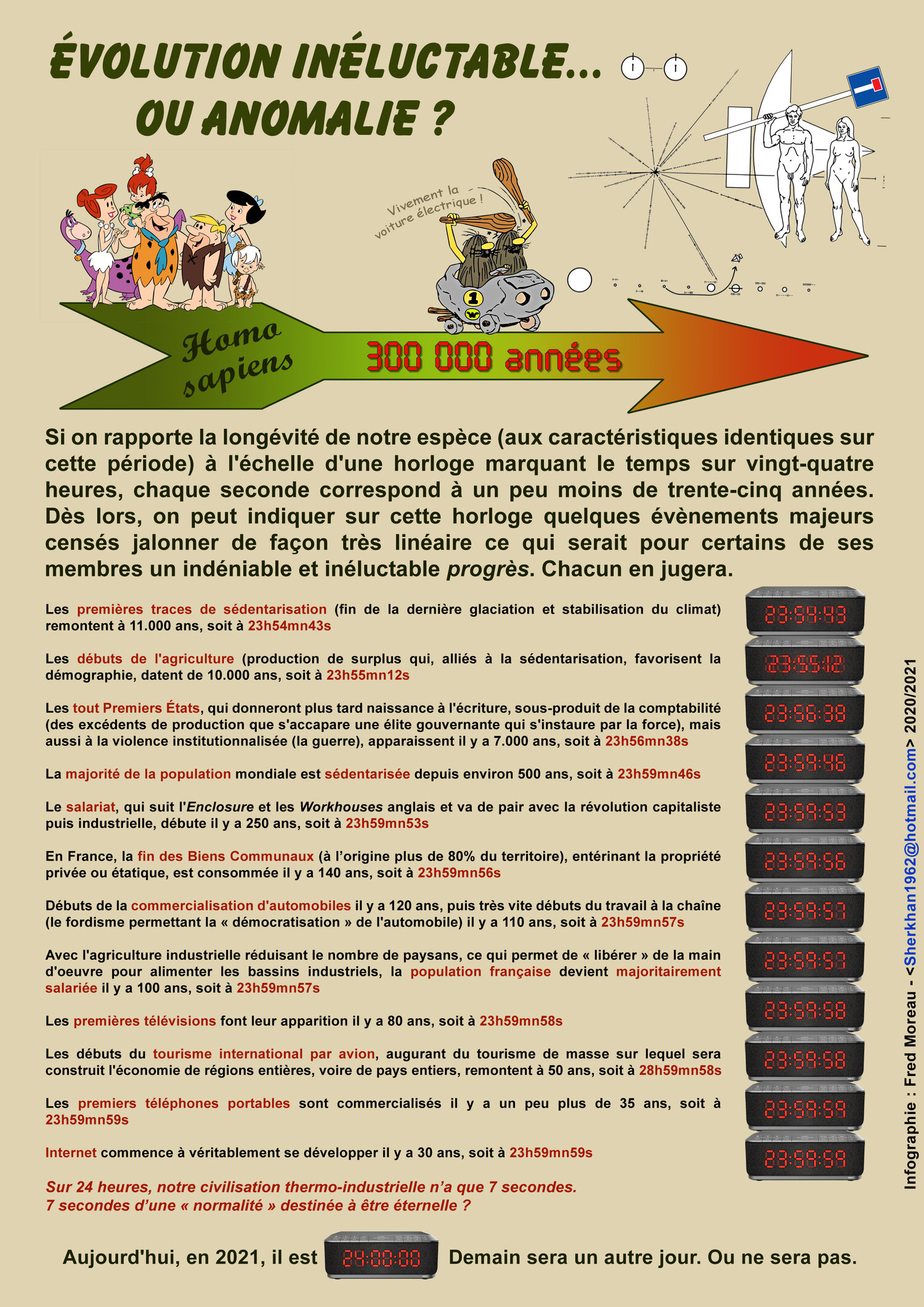 À l'évidence, il ne saurait être question pour ceux qui en tirent le plus grand profit, et ceux pour qui elle est un gage de stabilité sociale, et donc un formidable moyen de contrôle, de remettre en cause cette dépendance, dorénavant présentée comme incontournable, de même évoquer ce temps où l'emploi salarié n'existait tout simplement pas, soit pendant 300.000 ans, l'âge de notre espèce.