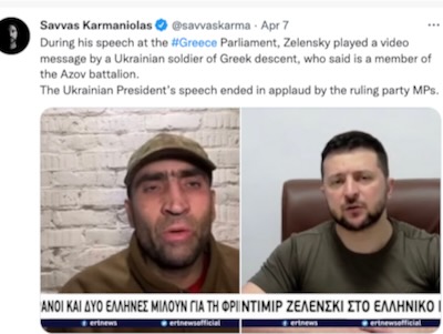 Le 7 avril 2022, le président Zelensky s'est exprimé devant le Parlement grec. Il a passé une courte vidéo durant son intervention. Un ukrainien d'origine grecque s'y est présenté comme membre du régiment Azov et a vanté le combat de sa faction contre les Russes.