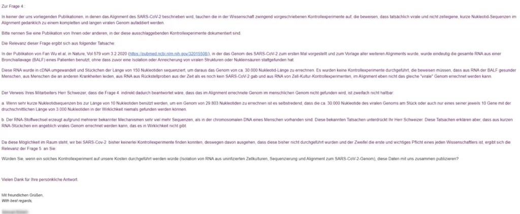 Si l'échantillon « isolé » comporte encore un autre matériel génétique, il n'est pas possible d'attribuer les séquences génétiques obtenues. L'affirmation qu'il s'agit ici d'une procédure standard dans la virologie n'améliore en rien cette situation. Au contraire, elle démontre l'aveuglement de la virologie.