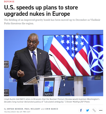 Le Pentagone déclare à chaque conférence de presse ne pas constater de signes, pouvant laisser entendre que la Russie serait prête à utiliser des armes nucléaires dans le conflit en Ukraine... et donc les Etats-Unis avancent à décembre la livraison en Europe, dans les bases de l'OTAN, de nouvelles bombes nucléaires, pouvant être utilisées lors d'un conflit, pour faire face à la menace russe, qu'ils viennent de reconnaître comme inexistante. Et pendant ce temps-là, les pantins européens continuent à applaudir, alors que leur enterrement politique a déjà eu lieu et qu'ils entraînent nos pays dans leur chute sans fin.