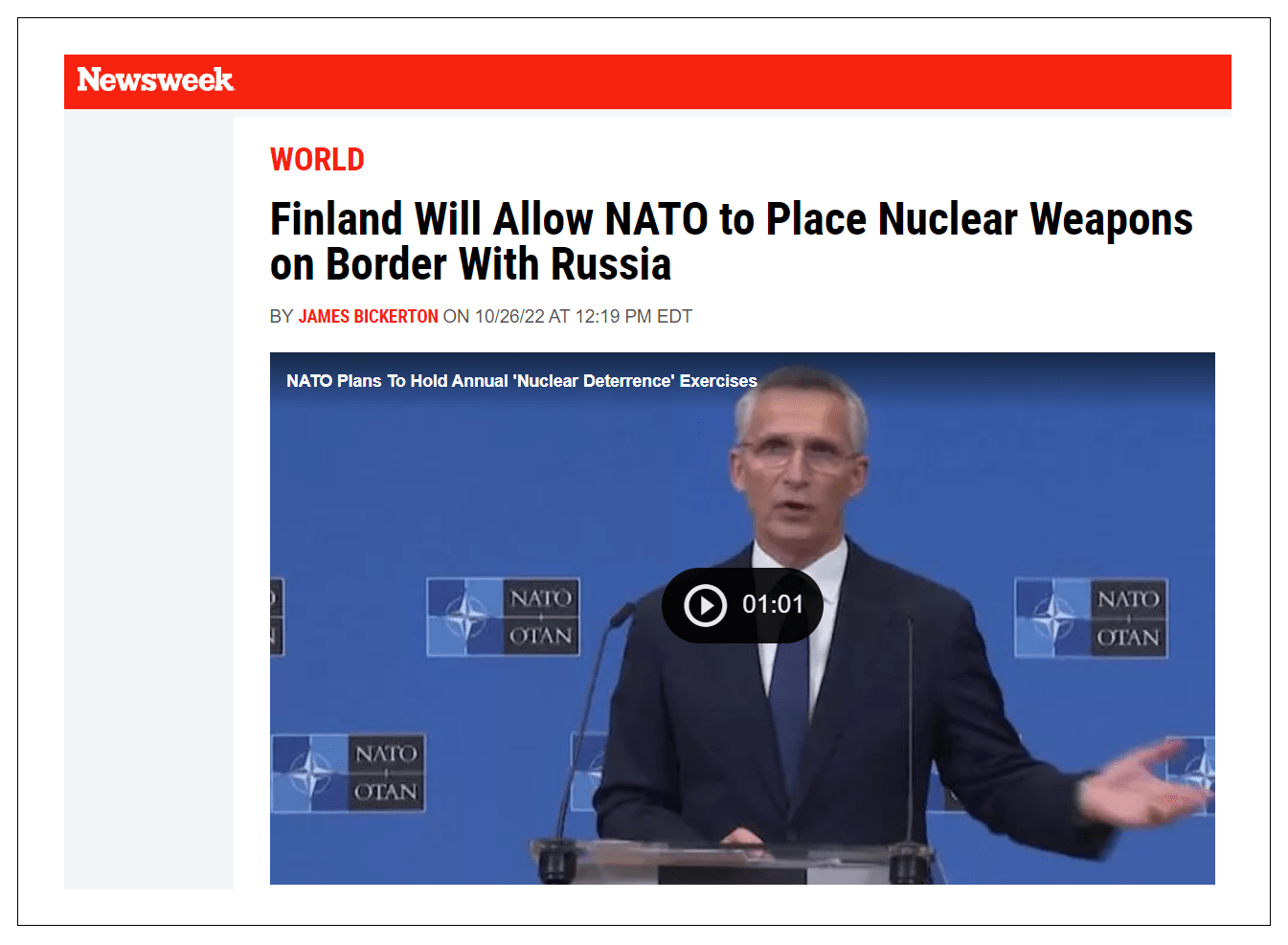« Des sources internes de la politique étrangère ont déclaré à Iltalehti que cela signifie que les armes nucléaires de l'OTAN pourraient transiter par ou être basées sur le territoire finlandais. De plus, il n'y a aucune restriction à l'établissement de bases de l'OTAN dans le pays. »