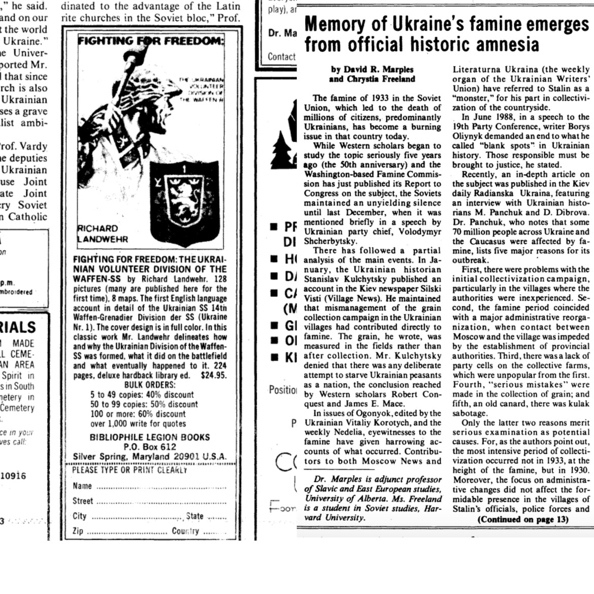A 1988 edition of Ukrainian News (below) featured an article co-authored by Freeland, followed by an ad for a book called "Fighting for Freedom" which glorified the Ukrainian Waffen-SS Galician division.