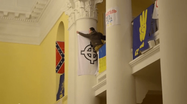 In the midst of the coup attempt, a group of neo-Nazi thugs belonging to the C14 organization occupied Kiev's city council and vandalized the building with Ukrainian nationalist insignia and white supremacist symbols, including a Confederate flag. When riot police chased the fascist hooligans away on February 18, 2014, they took shelter in the Canadian embassy with the apparent consent of the Conservative administration in Ottawa. "Canada was sympathizing with the protesters, at the time, more than the [Ukrainian] government," a Ukrainian interior ministry official recalled to the Canadian Broadcasting Corporation.