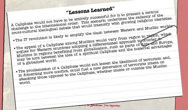Le scénario se termine avant que le calife ne soit capable d'établir une autorité à la fois spirituelle et temporelle sur un territoire – ce qui a historiquement été le cas pour les califes précédents. À la fin du scénario, nous identifions les leçons à tirer. »( « Mapping the Global Future ». p. 83)