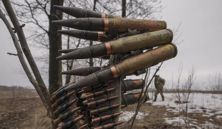 Des militaires ukrainiens tirent sur des positions russes à partir d'un obusier M777