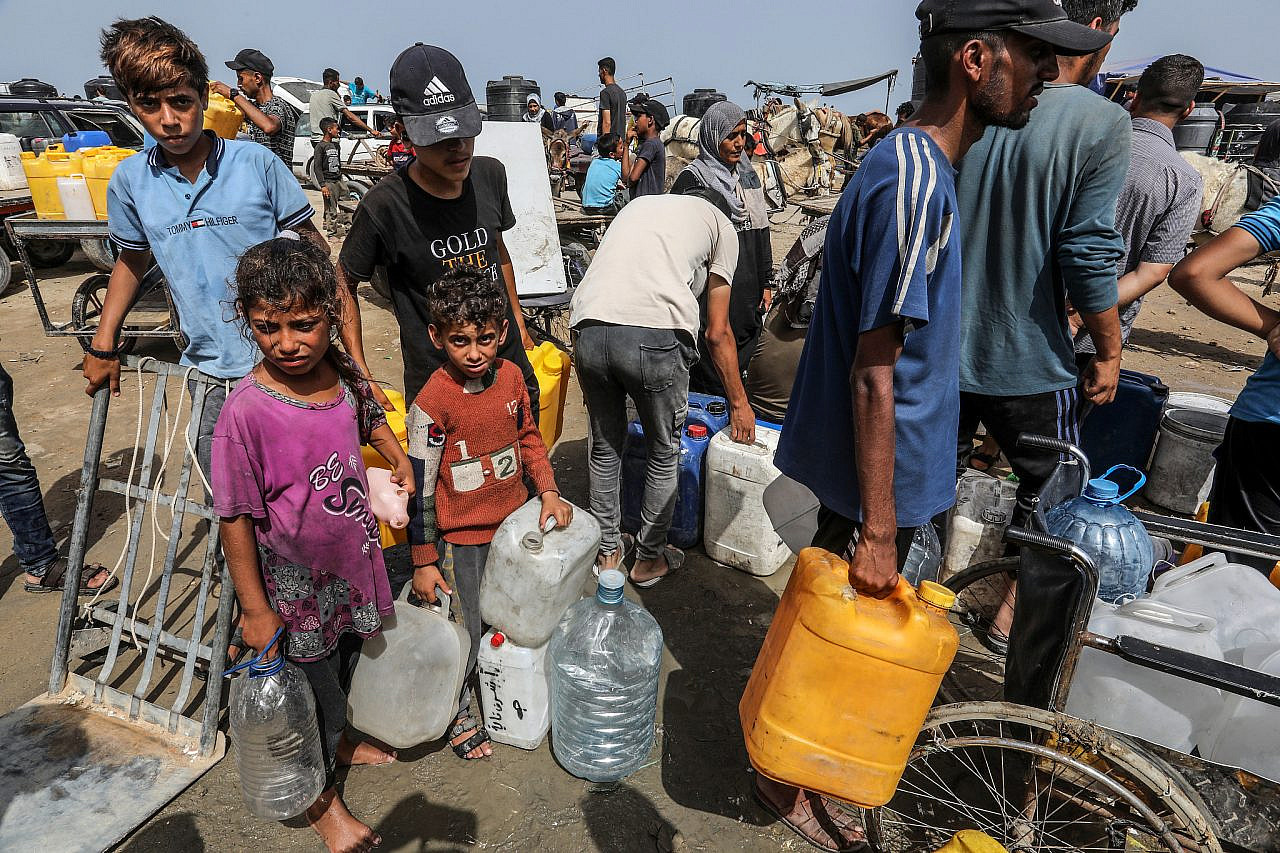 Des Palestiniens font la queue pour recevoir de l'eau potable à Deir al-Balah, au centre de la bande de Gaza, le 20 mai 2024. (Abed Rahim Khatib/Flash90)