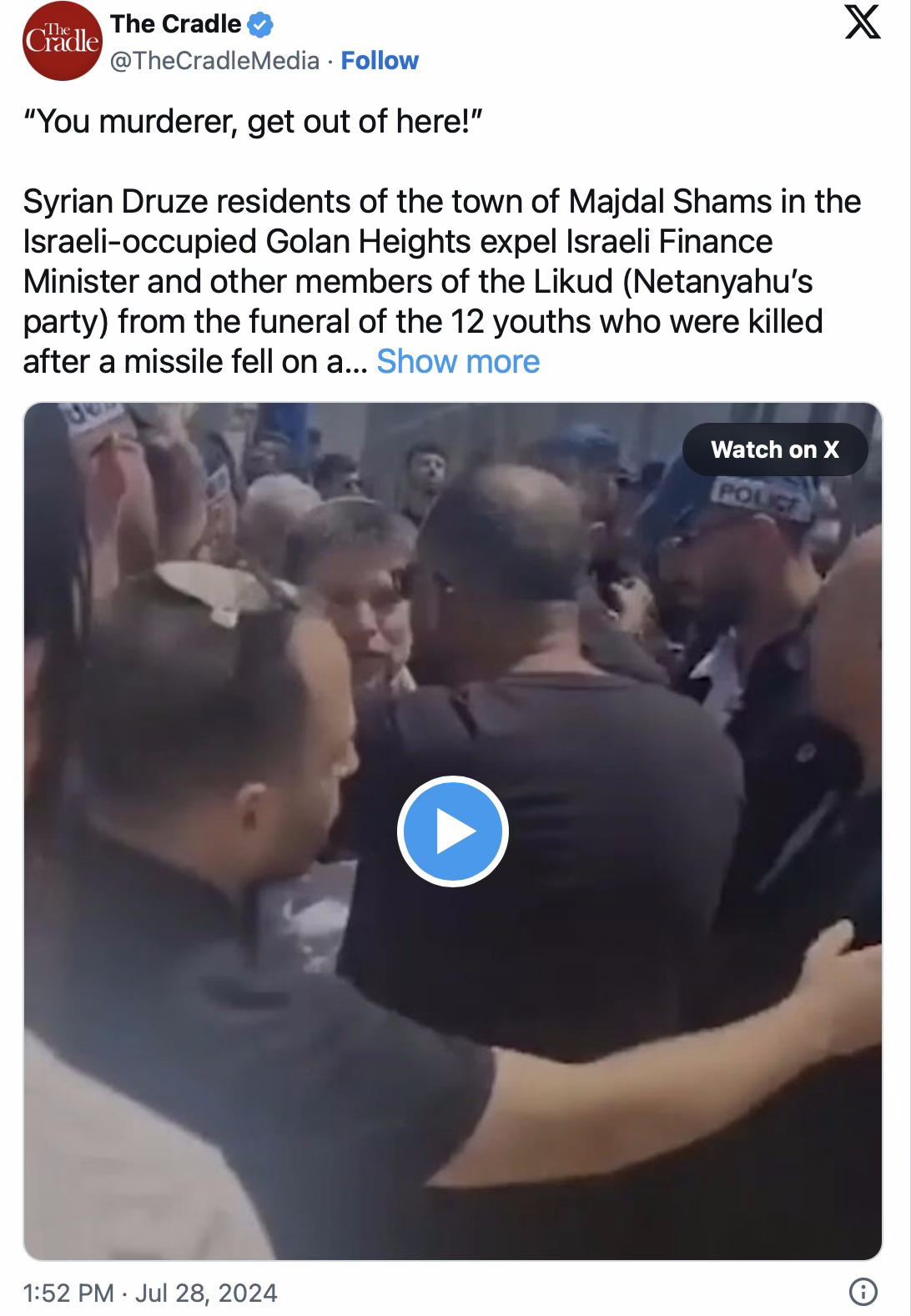 Le ministre israélien des finances, Bezalel Smotrich, ainsi que des membres du Likoud, ont été expulsés par les habitants de Majdal Shams alors qu'ils tentaient d'assister aux funérailles le 28 juillet.