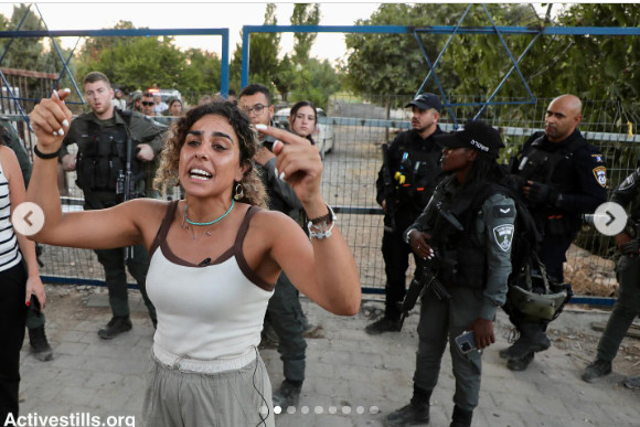 Activestills, 22 août 2024. Des membres de la famille palestinienne Qaysiya, expulsés de leurs terres, accompagnés de leurs partisans, affrontent des colons israéliens lors d'une manifestation contre l'établissement d'une nouvelle colonie dans la région d'Al Makhrour, près de Beit Jala, en Cisjordanie.