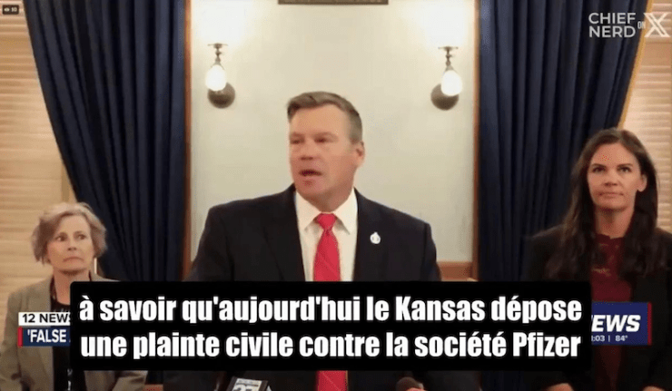 «Le Kansas dépose une plainte civile contre la société Pfizer en vertu de la loi sur la protection des consommateurs du Kansas, cherchant à obtenir des sanctions pécuniaires civiles renforcées, des dommages-intérêts et une injonction pour des déclarations trompeuses et mensongères faites dans la commercialisation de son vaccin contre le COVID-19».
