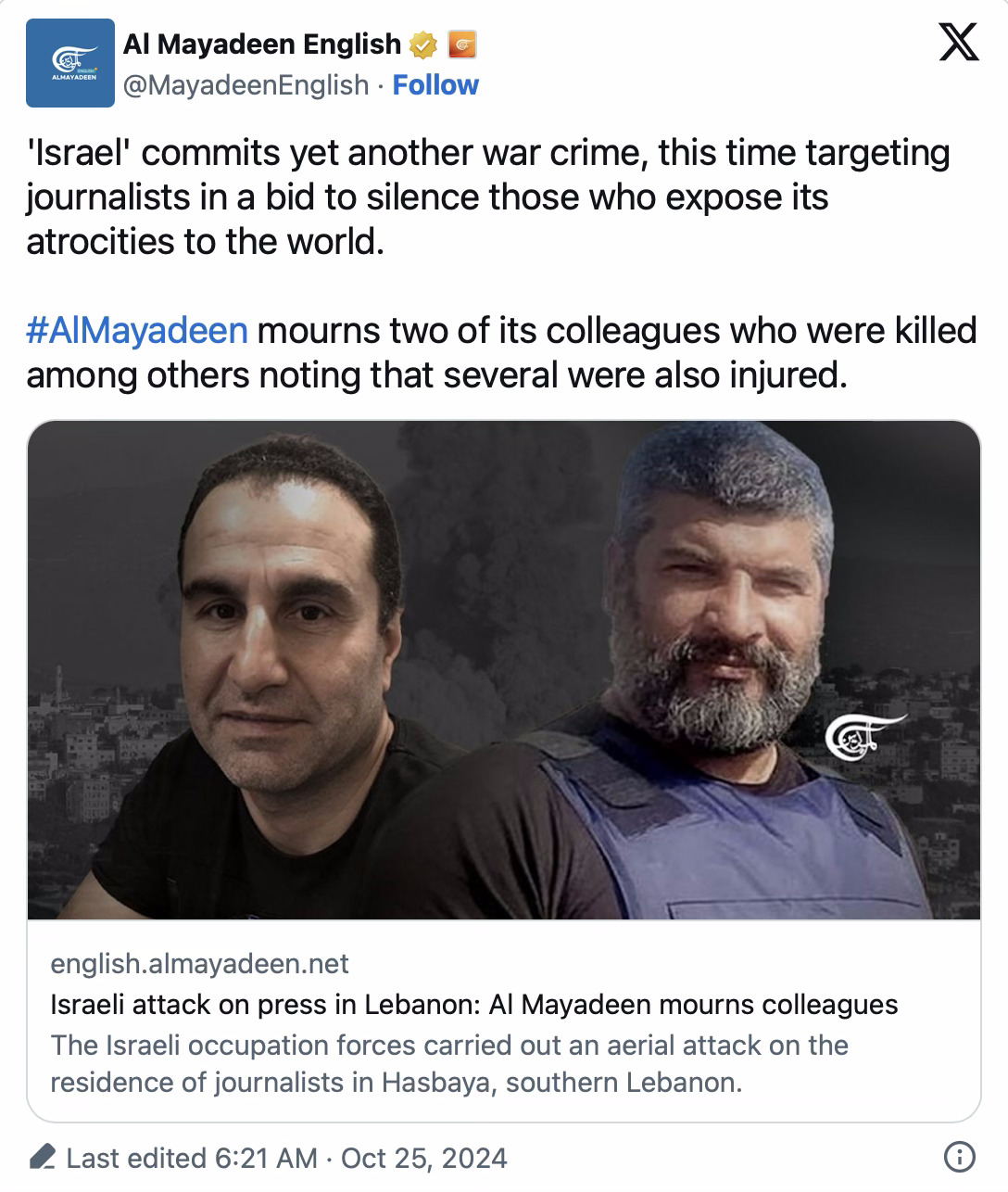"pleinement responsable de ce crime de guerre, au cours duquel il a pris pour cible des équipes de journalistes, y compris l'équipe d'Al Mayadeen".